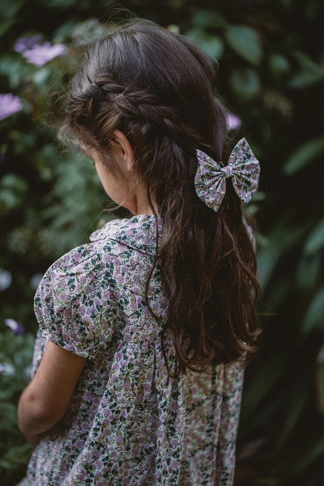 Dresses and bows are folded, wrapped in tissue paper and placed in matching cotton drawstring bags. Dresses are ready to be received as a gift.