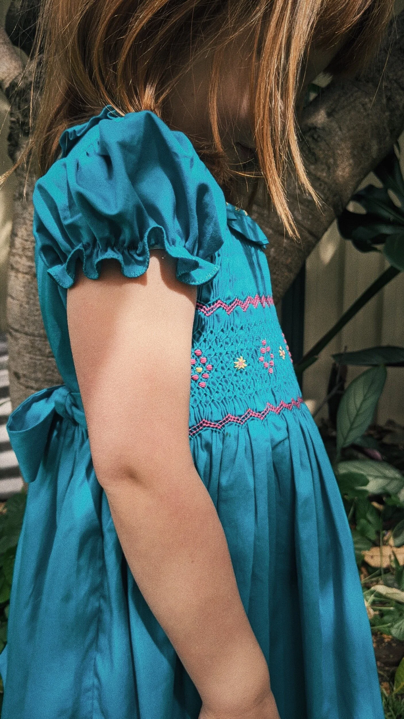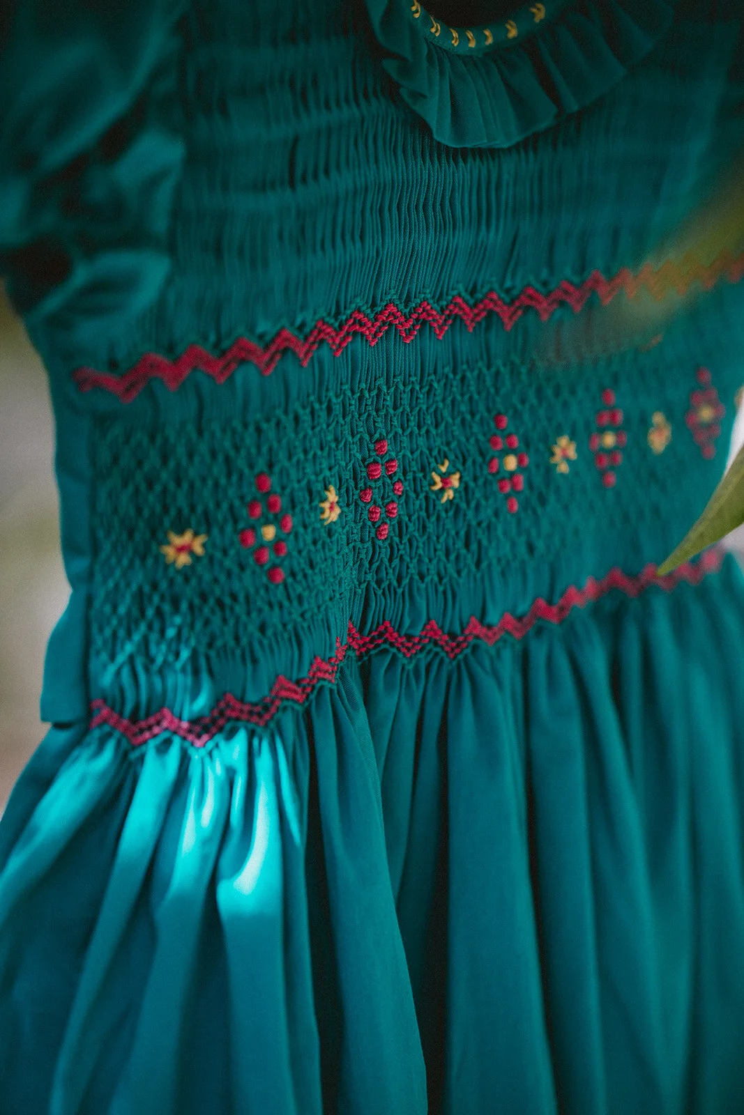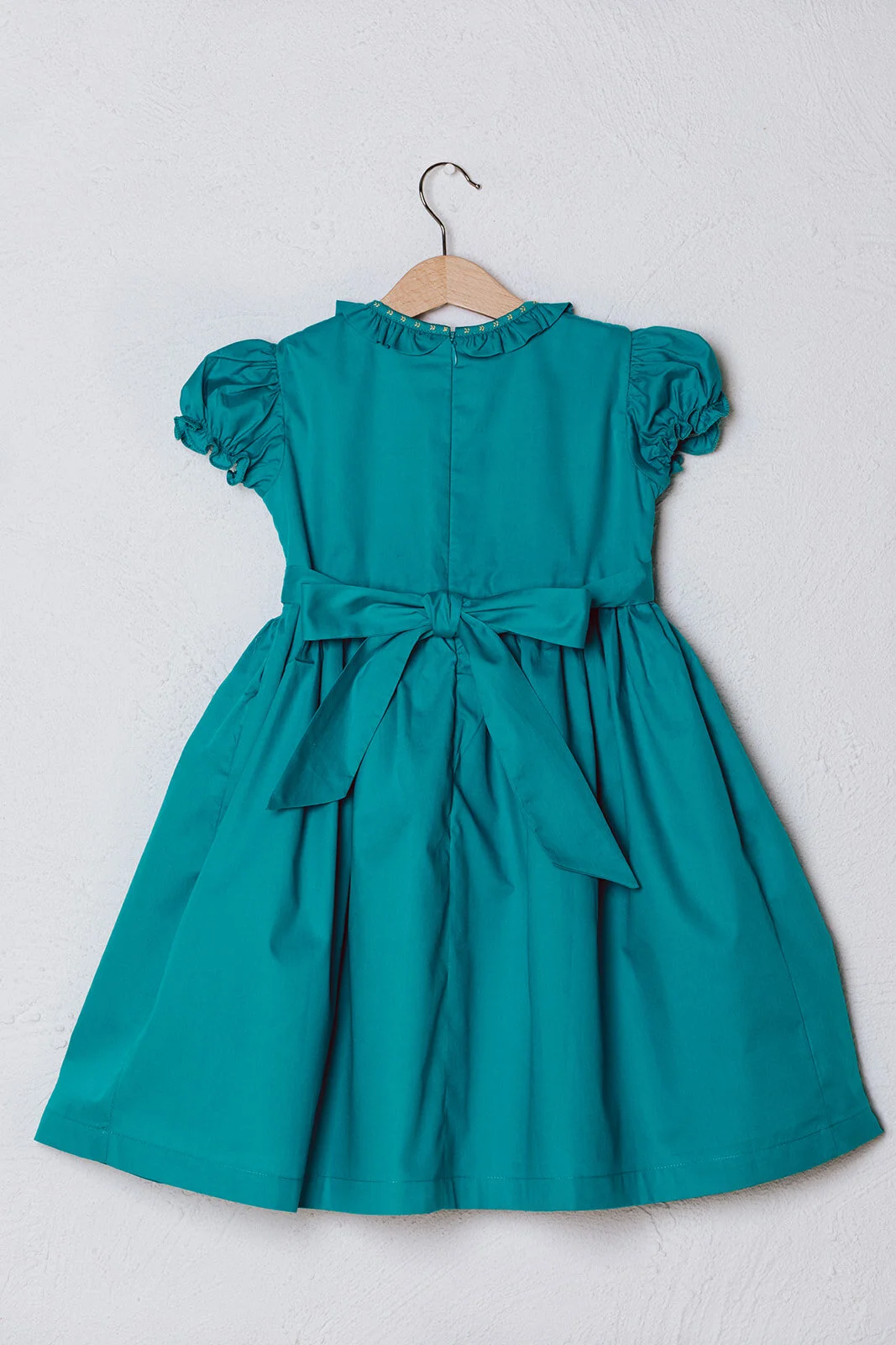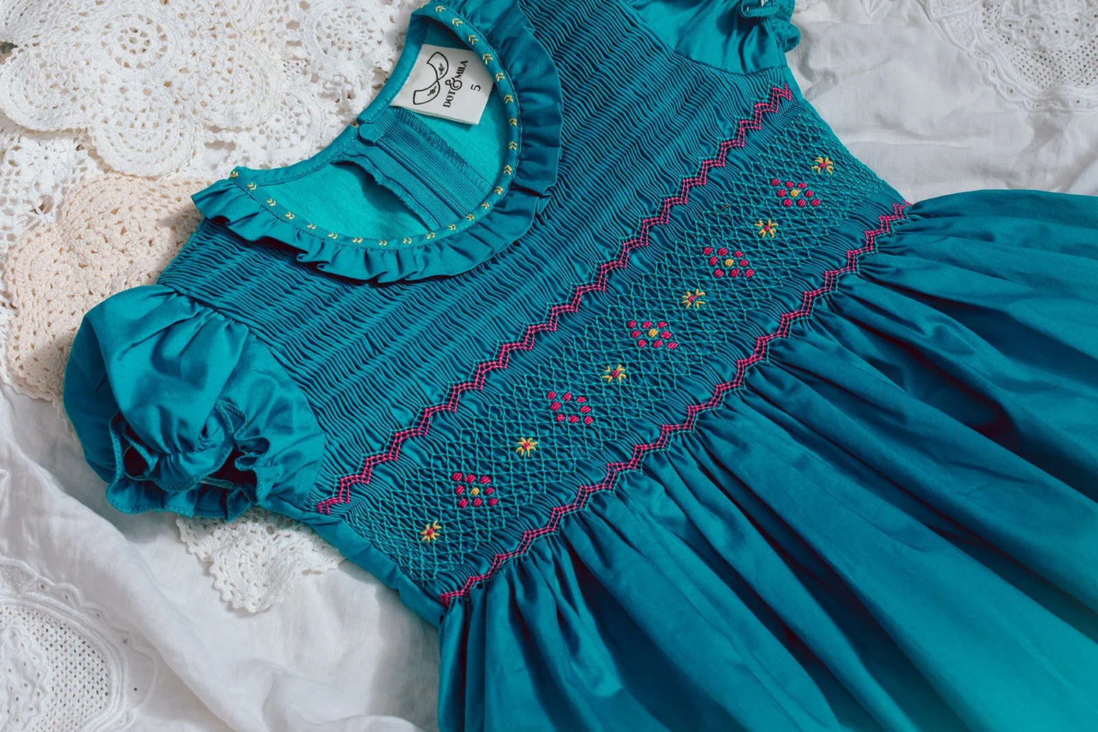 Chest measurements are made from armpit to armpit. Length measurements are made from shoulder to hemline. The handmade nature of our dresses means the measurements will be subject to a tolerance of approx +/- 1cm. Smocking in itself is an inexact artform, and also provides an elasticity to the dress’ fit.